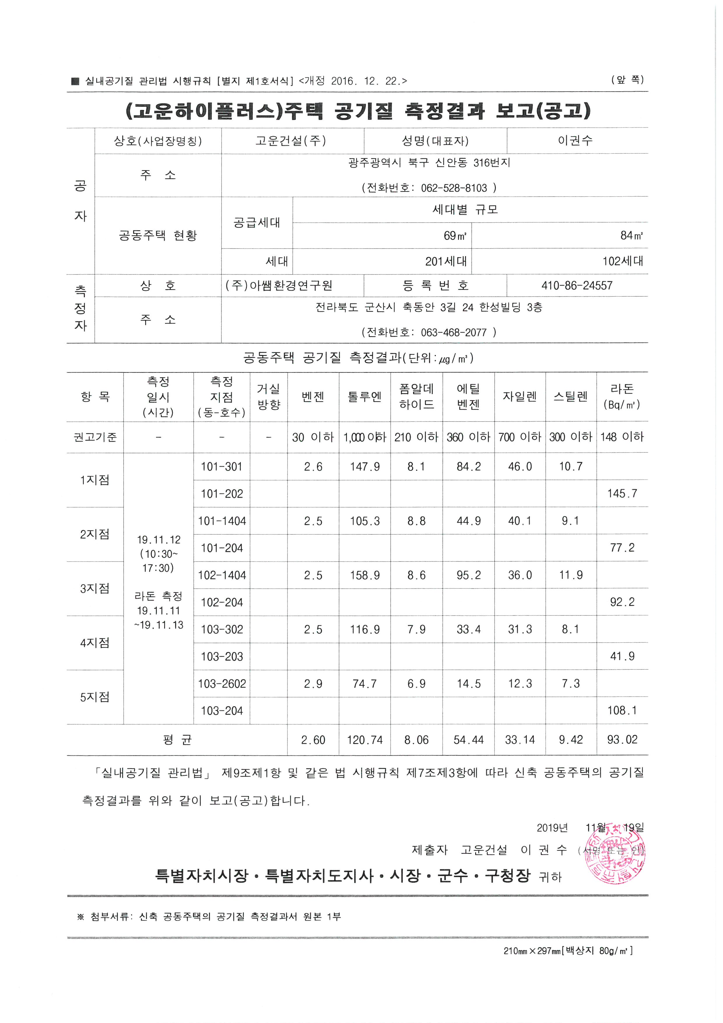 신안동 고운하이플러스 주택공기질 측정결과 보고